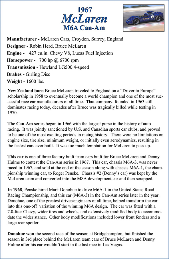 To find out more information about this 1967 McLaren M6A please contact us at 510.887.7223. More information to follow.